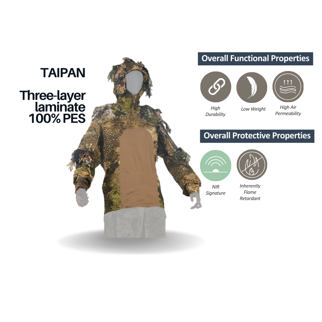 The TAIPAN CIVIL line by PHANTOMLEAF® is characterised by maximum comfort and freedom of movement. Due to a high cotton content and integrated comfort stretch in the construction of the fabric, combined with ripstop features make the TAIPAN CIVIL line lightweight, high air-permeable and hard-wearing. The camouflage clothing combines a wide body fit and thought through pocket solutions, resulting in a state-of-the-art wearing concept for the user. The camouflage effect is equipped with the patented PHANTOMLEAF® camouflage technology in the visual and near infrared range.