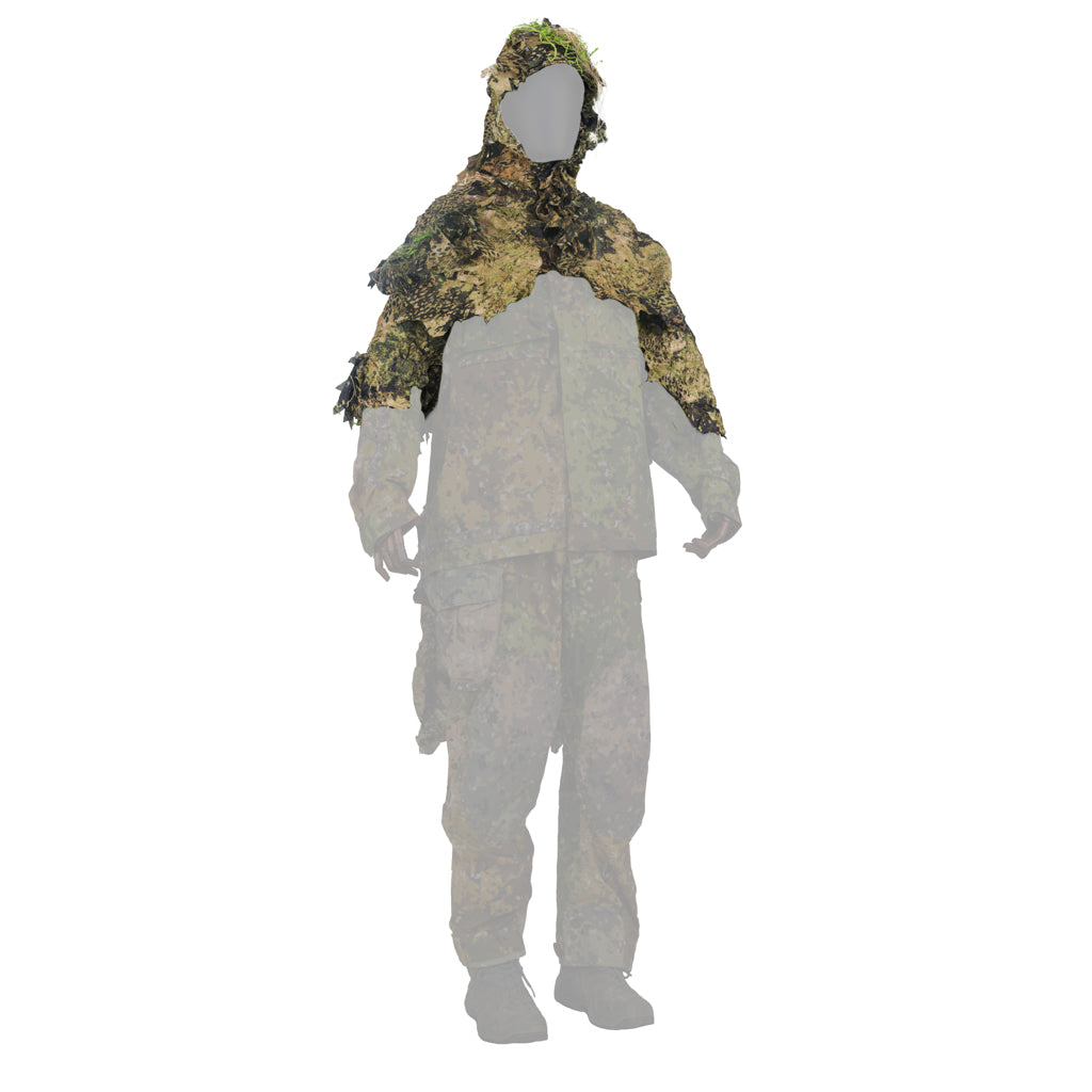 Camouflage cloak covering the most conspicuous parts of the body such as the head, shoulders, upper back and a small rucksack.